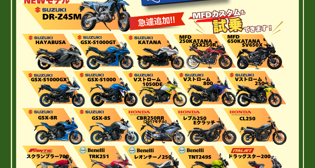 MFD埼玉戸田店は、スズキ・ホンダ・ファンティック・プジョー規取扱店です。新車はもちろん、国内、海外メーカーのお買い得中古車情報やカスタム情報、ツーリングやサーキット走行会などの最新情報をお届けします。お見逃しなく!