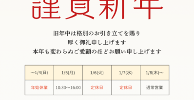 28日をもちまして2025年の営業を終了いたしました。 本年も多くのお客様にご愛顧いただき、心より御礼申し上げ…